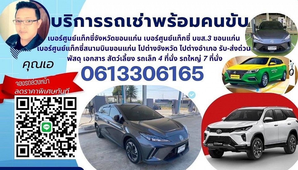 การให้บริการของขอนแก่น เช่ารถพร้อมคนขับ รับส่งทั่วอีสานไม่ว่าจะเป็น ลพบุรี นครสวรรค์ เพชรบูรณ์ บริการรถเหมาทั่วประเทศรับส่งทั่วไทยไม่ว่าจะเป็นแท็กซี่รถยนต์นั่งส่วนบุคคล SUV รถใหญ่ 7 ที่นั่งรถตู้รถ VIP Innova รุ่นใหม่รถครอบครัวอเนกประสงค์รถตู้ VIP ถ้าเป็น SUV 7 ที่นั่งใส่สัมภาระได้เยอะในกรณีเดินทางไปเที่ยวสถานที่ท่องเที่ยวต่างๆทางภาค Zone อีสานหรือจะไปเหนือกลางใต้ได้ตลอด 24 ชั่วโมง ถ้าเป็นรถตู้ VIP 8-9 ที่นั่ง รถติดเครื่องเสียงประดับไฟสวยหรู เดินทางเป็นหมู่คณะทัศนาจรศึกษาไปเที่ยวน้ำตกกาญจนบุรีไทรโยคหัวหินเชียงใหม่เราก็มีรถตู้ VIP ให้บริการ หรือจะรับส่งสนามบินดอนเมืองสุวรรณภูมิ อูตะเภา- ดอนเมือง เชียงใหม่ ลำปาง อุตรดิตถ์ หรือจะไปสถานที่ท่องเที่ยวต่างๆ ในจังหวัดชลบุรี พัทยาใต้ ระยอง บางแสน พัทยา ชลบุรี บ่อวิน ศรีราชา กำแพงเพชร หรือจะเป็นรถกระบะตู้ทึบเราก็มีให้บริการไว้สำหรับคุณลูกค้าที่ต้องการขนย้ายของย้ายห้องย้ายตู้เสื้อผ้าเครื่องซักผ้าตู้เย็น ไปต่างจังหวัดหรือจังหวัดใกล้เคียง รถที่ให้บริการส่วนใหญ่นั้นคนขับปลอดภัยมีใบขับขี่สาธารณะรถตรวจสภาพความพร้อมตลอดอายุการใช้งานของรถ เราให้บริการรถรุ่นใหม่สะอาดสะดวกและปลอดภัย ส่วนรถที่ให้บริการเราสามารถ ติด ตามได้ของหายได้คืน โทร.0613306165